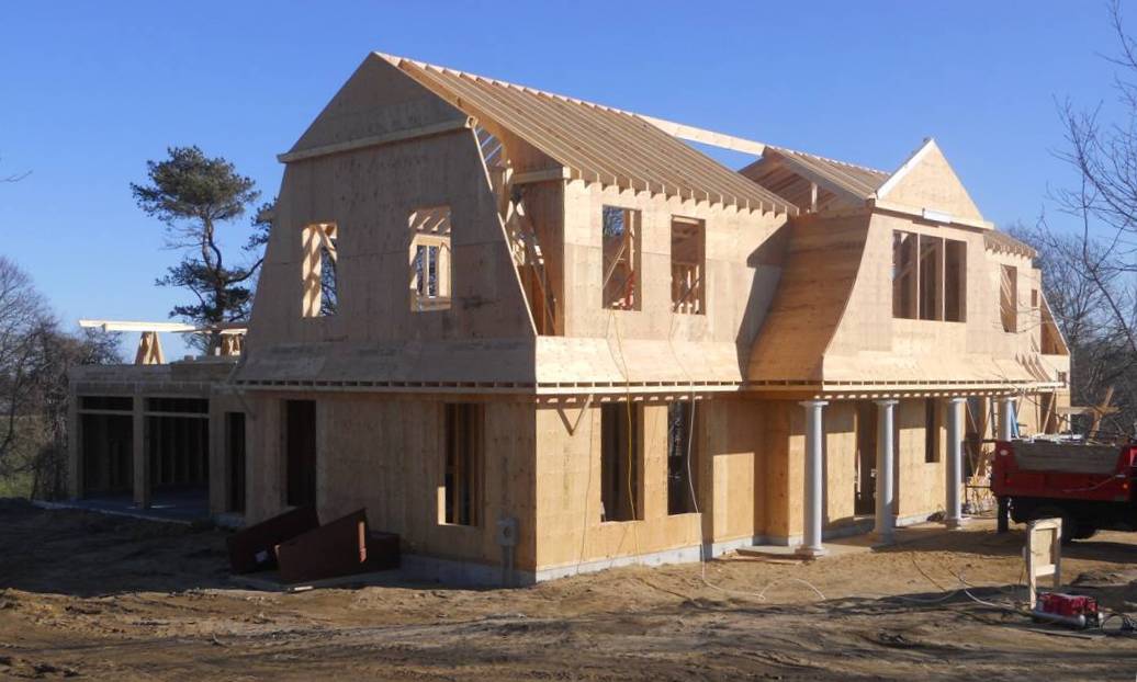 If you are seeing this series of “House on Cape Cod” posts for the first time, today’s post follows two others (and precedes many more) which are memorializing the construction progress on one of our recent projects, a home in Chatham, MA. The homeowner visited the site yesterday and snapped these photos, which show good progress in the roughly three weeks since our previous post. With the gambrel gables framed and the roof planes well established, the form of the roof has taken shape and is marking its silhouette against the sky.