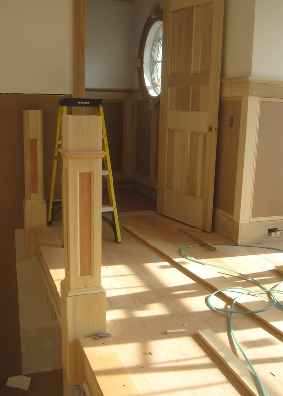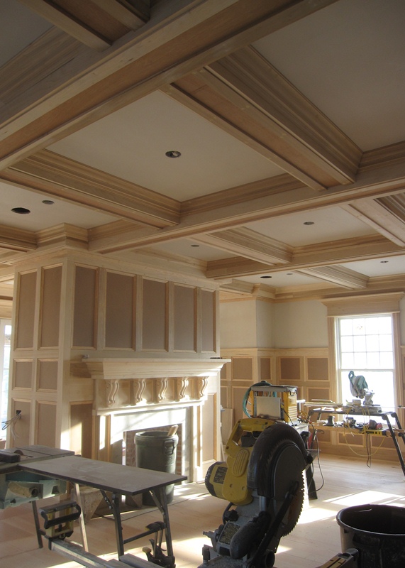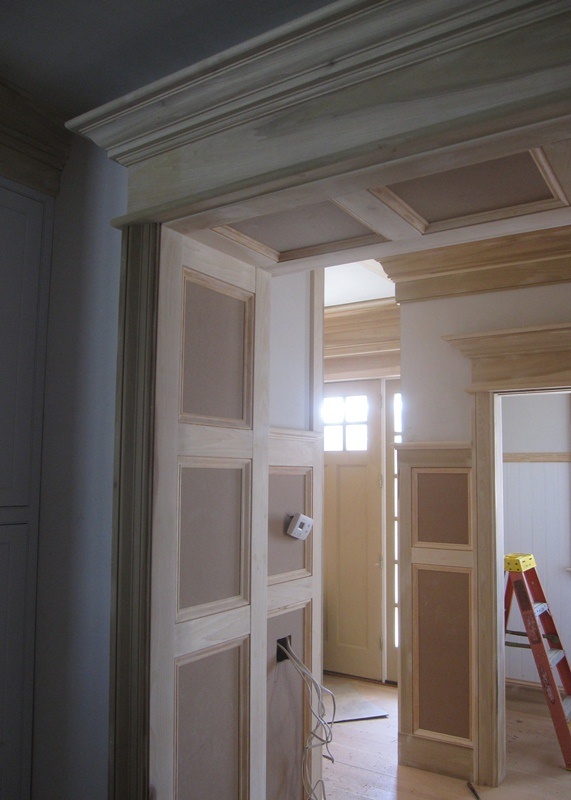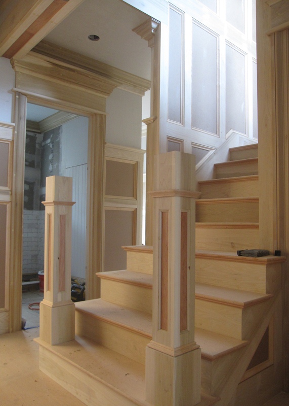 In terms of progress, the construction has come a very long way since I last posted on April 29. There has been enormous progress in the interior of the house, which yesterday was filled with the sweet smell of raw wood, carried through the air by fine particles of saw dust that were being now and then pushed out of a buzzing table or compound miter saw. The stair builder was setting his newel posts and the trim carpenters were fabricating crowns for door and window heads. Much of the same woodworking that occupied the day yesterday has been occupying the days of hardworking trim carpenters stationed in this house since early June, and their devoted work is now nearing completion. As these photos show, all those months of work have resulted in interior spaces that are very prominently appointed with wood trim. Very few rooms are without paneled wainscoting, each capped with profiled molding, in many cases at six feet in height (the ceiling height on both floor levels is ten feet high).
