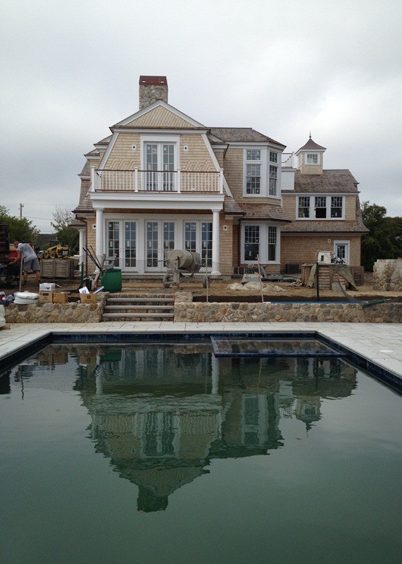 Yesterday landscapers were raking out top soil to finished grades and setting bluestone in mortar to form paths between doors and the hardscape terrace that surrounds the swimming pool. Fencing was under way and the driveway base was being prepped for paving.