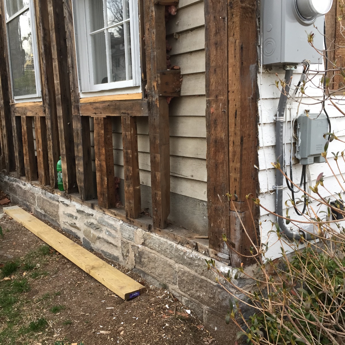 In the photo below, notice the lines of the former gambrel roof structure. The vertical boards are the original 1 1/2″ thick sheathing from 1800. The horizontal boards are the sheathing from 1900. Where they meet displays the line of the original roof, except that the original upper gable was lopped off. It and the original ridge likely interfered with the new attic and new roof structure. Basically, what was benign to the 1900 alteration was left intact, and what got in the way was removed. The “furring studs” that were used to encapsulate the original clapboard and trim on the front and rear walls are actually the original roof rafters, re-purposed. HA! Is this not proof that “green” building practices are not in fact new to our times?