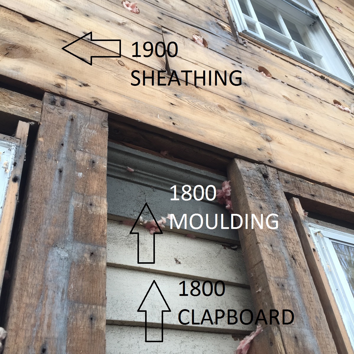 A partial demolition and removal of clapboards confirmed the notes and our theories. The second story that was built in 1900 was constructed outboard of the original building. In other words, the new structure encapsulated the former structure at the front and rear walls – the side walls remained original, since they shouldered no load from the new roof rafters. See below – the original clapboards, bed moulding and trim are intact beneath the build-out!