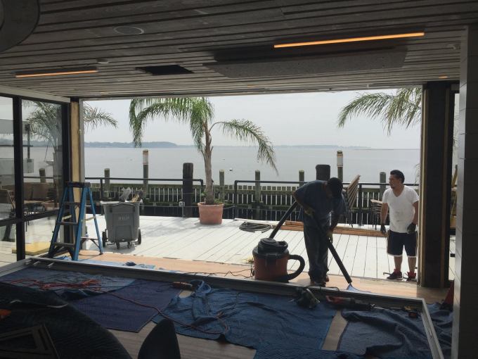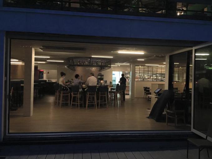 Below are two photos that I borrowed from the Shell & Bones Facebook page. The top photo is showing one of the openings with its operable panels being installed.  One of the great qualities of this particular spot in New Haven is in fact represented in the background of this photo.  To my mind, that scenery all on its own provoked the installation of operable glass panels, so that it might be gazed upon through wide expanses, unmolested by glass and mullions, while it lobs its salty breezes at sojourners who hoist their cocktail glasses and slurp at their oyster shells.  Oh my…you really must see how that works!