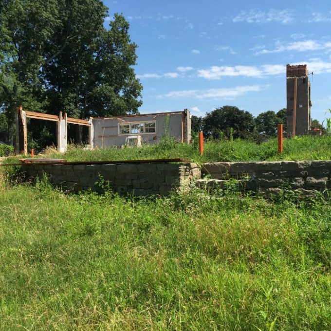 Along the way, the first floor walls were ultimately let go and demolished, though the footprint of the foundation still, to large measure, controlled what could take form. Existing granite veneer was left standing, while the rest of the house was taken down to the top of the foundation, which was then raised with concrete block.